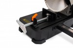 На рукоятке рычага устанавливается кнопка включения пилы. Для удобства работы с инструментом к кнопке добавляется фиксатор, блокирующий выключение инструмента при отпускании кнопки. Режущий инструмент полностью закрыт защитным кожухом, предохраняющим человека от травм во время работы. На некоторых моделях производители устанавливают два кожуха – один неподвижный, второй — сдвигающийся, полностью закрывающий зону резания.